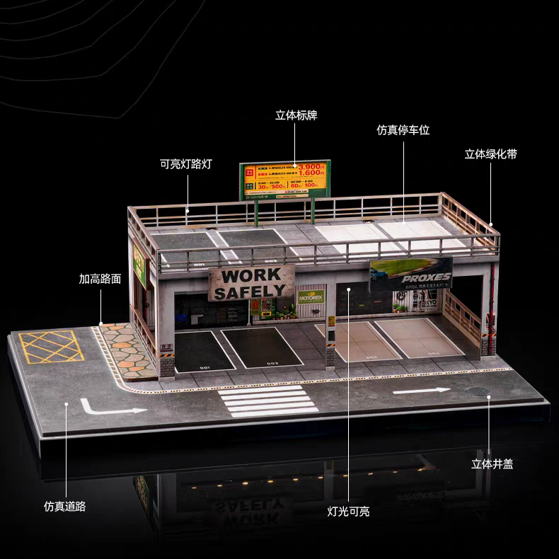 Compact double-layer parking workshop model at 1:64 scale, measuring 29.5×19.8×12cm and weighing 706g. Perfect for collectors and enthusiasts who appreciate detailed miniature replicas. This precision-engineered piece combines authentic design with practical dimensions, making it an ideal display piece for shelves or collections. Ideal for hobbyists seeking quality craftsmanship in a manageable size.
